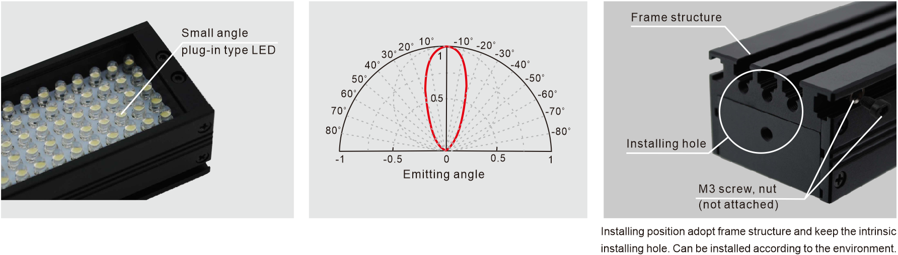 LED direction / Emitting angle / Multiple installation method: