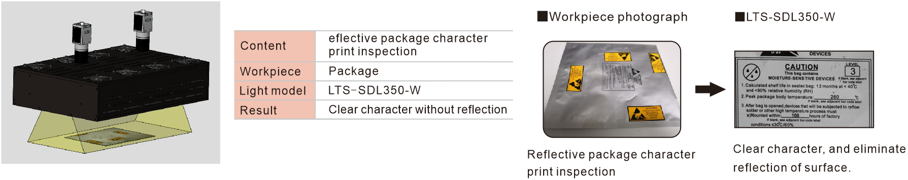 High power LEDs and special thermal design is adopted to get high intensity and uniformity. The SDL light is suitable for inspecting of reflective objects and works with coaxial line light to inspect PCB.