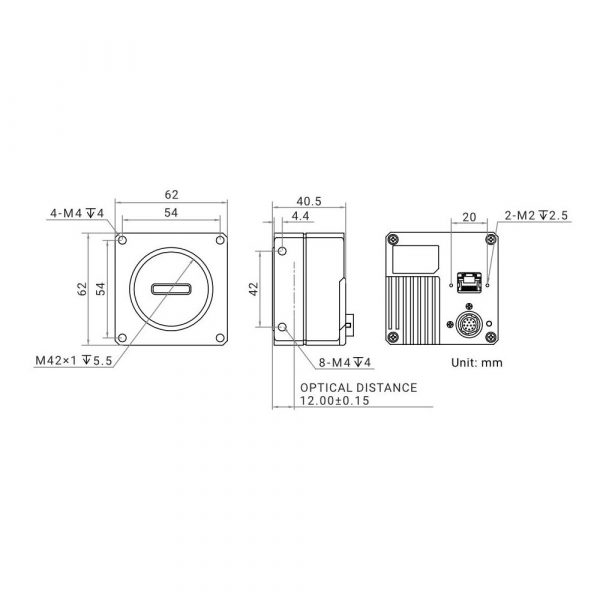 | Mechanical | Lens mount | M42 *1.0, optical back focal length: 12 mm (0.5″), applicable to F-mount, C-mount and others via lens adapter |