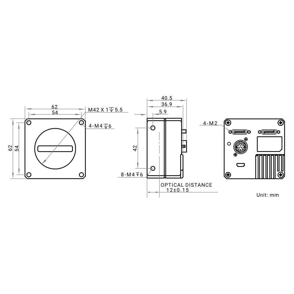 Mechanical Lens mount M42*1, optical back focal length: 12 mm (0.5″), applicable to F-mount, C-mount and lens of other types via lens adapter